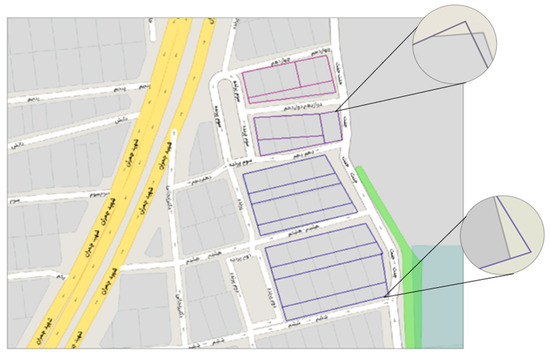 The open-source map of Tehran municipality https://map.tehran.ir (accessed on 5 September 2023) is available in jpeg format in Arc GIS software 10.8. It has been georeferenced using three points in the UTM coordinate system. The shape file of the building blocks has then been overlaid on the existing map. A visual comparison of the 2D map produced with the existing map can be seen in Figure 19.