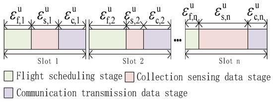 Furthermore, we consider a time slot system and divide a task into multiple equal duration time slots. Time slot allocation ensures that each UAV sends the data it has collected to the base station within the specified time slot, avoiding signal conflicts and maximizing the use of network bandwidth. According to the UAV’s data collection process, each time slot can be further divided into three phases, namely UAV flight trajectory scheduling, UAV collection sensing data, and UAV transmission of collected data to the BS, as shown in Figure 2. Let , and represent the lengths of the time slots allocated to three phases in time slot t, respectively. It must satisfy the condition , where denotes the maximum deadline for each time slot.