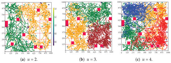 Figure 5 illustrates the flight trajectories of different numbers of UAVs collecting data from randomly and uniformly distributed GTs in real-time. In the heatmap shown in Figure 5, the color intensity is proportional to the amount of GT data, and the darker the color, the greater the amount of GT data. Figure 5a–c show that the UAV flight trajectory gradually evolves from initial irregular movement to a cooperative process when u = 2, 3, 4, respectively. Specifically, as the number of UAVs increases, their flight trajectories become more coordinated and efficient, enabling improved data collection. This increased cooperation ensures that the UAVs maximize their coverage area and data collection efficiency. Given the limited sensing range and working area of each UAV, each UAV may need to move multiple times to cover local areas and collect data. However, by employing efficient collaborative strategies, multiple UAVs can ensure the timeliness and effectiveness of data collection. For example, when the target distribution is relatively sparse, each UAV adapts its flight trajectory based on real-time environmental feedback, covering as many GTs as possible. This collaborative approach guarantees that the system maintains a high data collection rate, even in areas with uneven GT distribution or remote locations, ensuring that each GT is collected fairly. In addition, the system uses a CNN and GRU module to extract spatial–temporal features from the environment during the trajectory optimization process. The CNN module is used to extract the spatial features, while the GRU module helps process the temporal information. These components enable the UAVs to make real-time decisions based on dynamic environmental changes, optimizing their flight trajectory and improving overall performance. This is particularly beneficial when facing uneven target distribution or environmental fluctuations, as the system maintains strong data collection capabilities and collaborative performance even in challenging conditions.