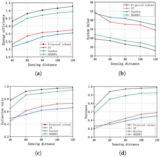 In Figure 6, we analyze the energy efficiency , average system delay , collection rate C and fairness index J of the four algorithms under different sensing distances R. Here, u = 2, m = 128, and R varies from 40 to 120 m. Figure 6a demonstrates that energy efficiency exhibits a monotonically increasing trend as the R increases. This is because a larger R enhances UAV communication coverage, leading to higher collection rates and better coverage, as shown in Figure 6c,d. This shows that UAVs can collect data in the target area more evenly, avoiding the situation where sensing data from some remote areas may be ignored or collected less frequently. Additionally, a larger R reduces UAV travel distance, thereby decreasing both flight energy consumption and transmission time of the collected data back to the BS, which decreases system energy consumption and average delay, as illustrated in Figure 6b. We note that the proposed algorithm and the MADDPG algorithm have a greater tendency to reduce the system delay at R = 120 m. This is because the collection rate and fairness index have reached a relatively saturated state at this point, and the system will pay more attention to reducing the delay to improve the energy efficiency indirectly. In practical applications, reducing delay is critical for tasks that require real-time data collection, such as environmental monitoring or emergency response. However, a larger R may also lead to an increase in communication load, so it needs to be balanced against the energy constraints of the system. Especially in environments with high interference or limited bandwidth, increasing R may not always lead to better performance, so additional strategies are needed to mitigate communication problems.