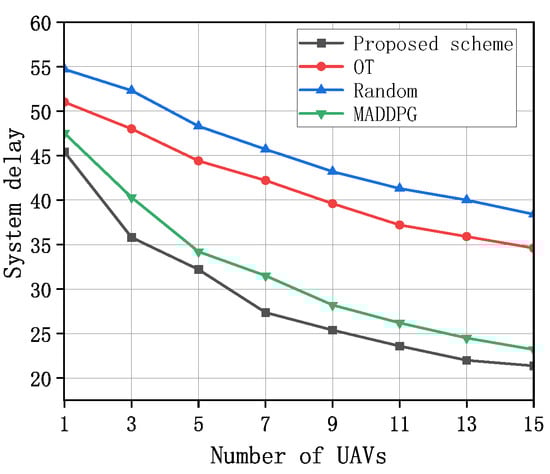 Figure 7 analyses the system average delay of the four algorithms under different numbers of UAVs. As the number of UAVs increases, the system average delay of all four algorithms exhibits a decreasing trend. This reduction is primarily due to the fact that by deploying more UAVs, the data collection burden on each UAV is alleviated, leaving ample time for data collection and transmission. Overall, the proposed algorithm achieves reductions in average system delay of 56.1%, 48.8%, and 9.64% compared to the Random, OT, and MADDPG algorithms, respectively. This performance improvement highlights the advantages of the centralized training distributed execution approach, in which UAVs share global experience and model parameters to update local policies. With a shared global model, UAVs are more synchronized and can coordinate decisions more effectively. This efficiency is particularly important in application scenarios that require real-time data collection and trajectory scheduling, such as disaster response, environmental monitoring, and autonomous patrolling. In contrast, the MADDPG algorithm focuses on the independent decision-making of each UAV. Although it provides flexibility in a distributed system, the algorithm relies on local policy updates and requires frequent communication between UAVs to achieve collaboration, resulting in high communication overhead. As a result, MADDPG is more suitable for flexible and scalable systems that can accommodate dynamic changes, such as systems where UAVs can join or leave at any time. For the Random and OT schemes, although they are relatively simple, their limitations in global optimization and learning capacity hinder their ability to fully leverage the potential of multi-UAV collaboration. This makes them less effective in complex systems that require efficient and adaptable communication strategies. It should be noted that the advantage of proposed algorithm and the MADDPG begins to diminish as the number of UAVs continues to increase. This can be seen from the fact that the average system delay stabilizes between u = 11 and u = 15. It shows that as the number of UAVs increases, so does the action space and model complexity, and thus system gain and scalability will be limited to a certain extent in larger-scale systems.