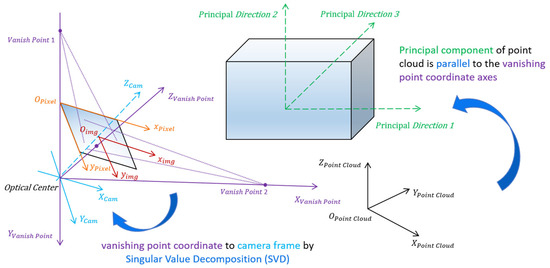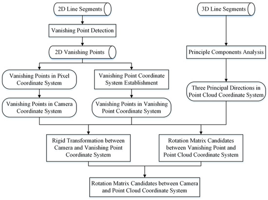 - A robust and automatic workflow is provided for calculating rotation matrix candidates between the camera coordinate system and the point cloud coordinate system, leveraging vanishing point directions under the Manhattan hypothesis.