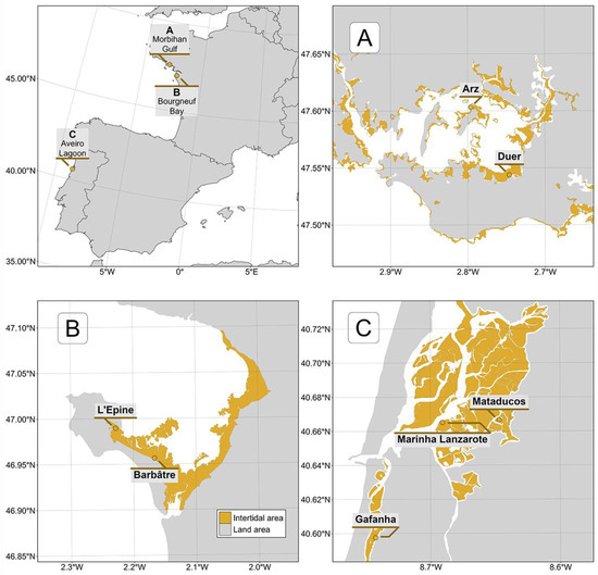 Location of drone flights in France and Portugal. (A) Gulf of Morbihan (Two sites), (B) Bourgneuf Bay (Two sites), and (C) Ria de Aveiro Coastal Lagoon (Three sites). The golden areas represent the intertidal zone.