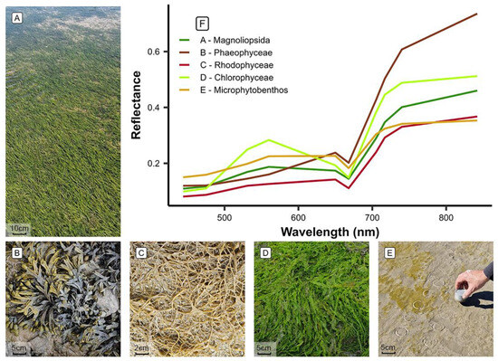 The five taxonomic classes of vegetation used to train the Neural Network model and an example of their raw spectral signatures at the spectral resolution of the Micasense RedEdge Dual MX. (A): Magnoliopsida (Zostera noltei); (B): Phaeophyceae (Fucus sp.); (C): Rhodophyceae (Gracilaria vermiculophylla); (D): Chlorophyceae (Ulva sp.); (E): Bacillariophyceae (Benthic diatoms). (F): Spectral signature of each vegetation class. Classes and species taxonomy following the WORMS—World Register of Marine Species classification.