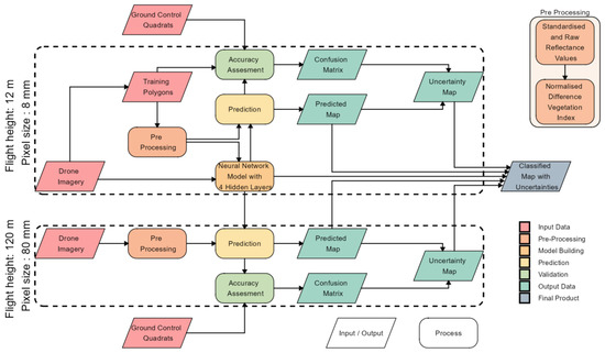 Schematic representation of the workflow. Parallelograms represent input or output data, and rectangles represent Python processing algorithms. The overall workflow of this study is divided into two distinct parts based on the spatial resolution of the drone flights: high-resolution flights (pixel size: 8 mm) were utilized for training and prediction of the Neural Network model, whereas lower-resolution flights (pixel size: 80 mm) were solely employed for prediction and validation purposes. Validation has been performed on both high- and low-resolution flights.
