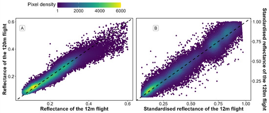 Comparison of reflectance retrieved from both low-altitude and high-altitude flights over a common area. The black dashed line represents a 1 to 1 relationship. The left (A) plots raw data, and the right (B) plots standardized data (Equation (1)).