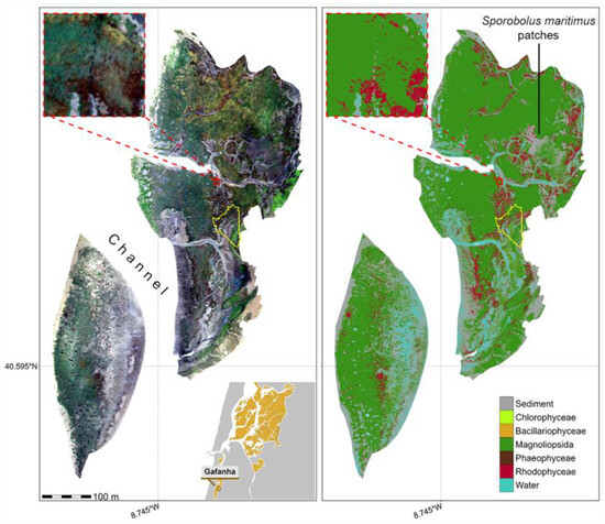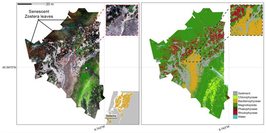 Among the high-altitude flights, the flight acquired over the inner part of Ria de Aveiro coastal lagoon covered the largest area with approximately 1.5 km2 (Figure 7). The vegetation present at the site was dominated by seagrass and red macroalgae. The classification provided consistent results, with a patchy seagrass meadow mixed with red macroalgae on the eastern part of the site. As shown in the zoom (Figure 7), the edges of the meadow were mixed with green macroalgae (Ulva spp.), which the model agreed with (F1 score of 0.89 for green algae, 0.97 for seagrass and 0.98 for red algae).
