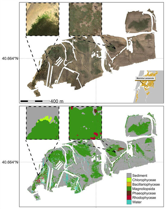 RGB ortho-mosaic (Top) and Prediction (Bottom) of the flight made in the inner part of Ria de Aveiro coastal lagoon, Portugal. The total extent of this flight was about 1.5 km2 with a resolution of 80 mm per pixel. The zoom inserts cover an area equivalent to the size of a 10 m Sentinel-2 pixel.