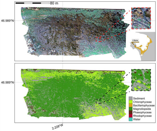 The flight over L’Epine in Noirmoutier Island, France (Figure 8), was conducted near a dike that crossed the northern part of the site from West to East. Alongside this dike, Fucale brown macroalgae (Fucus spp., Ascophyllum nodosum) were attached to sparse rocks, and stranded green algae (Ulva spp.) could be observed, which was correctly reproduced by the prediction (Figure 8 bottom). This site was characterized by a high mixture of green macroalgae and seagrass, but these two classes were correctly discriminated by the classifier (F1 score of 0.97 and 0.98, respectively).