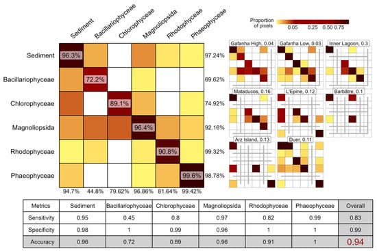 A global confusion matrix on the left is derived from validation data across each flight, while a mosaic of confusion matrices from individual flights is presented on the right. The labels inside the matrices indicate the balanced accuracy for each class. The labels at the bottom of the global matrix indicate the User’s accuracy for each class, and those on the right indicate the Producer’s Accuracy. The values adjacent to the names of each site represent the proportion of total pixels from that site contributing to the overall matrix. Grey lines within the mosaic indicate the absence of validation data for the class at that site. The table at the bottom summarizes the Sensitivity, Specificity, and Accuracy for each class and for the overall model.