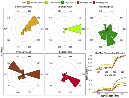The spectral bands at 444, 717, and 842 nm of the Micasense camera did not provide important information to discriminate any of the vegetation classes. The band at 531 nm was the most important predictor by far for the classifier to accurately predict Chlorophyceae. In fact, at this wavelength, the Chlorophyceae spectra showed the highest reflectance among all vegetation classes (Figure 10). The bands at 531 and 740 nm were the most important predictors for Phaeophyceae, corresponding to the lowest reflectance among all classes. Bands at 475 and 560 nm were the most important predictors for Bacillariophyceae and Rhodophyceae, respectively. Four predictors, ranging from the green (560 nm) to the RedEdge (705 nm) bands, were important to accurately predict Magnoliopsida.