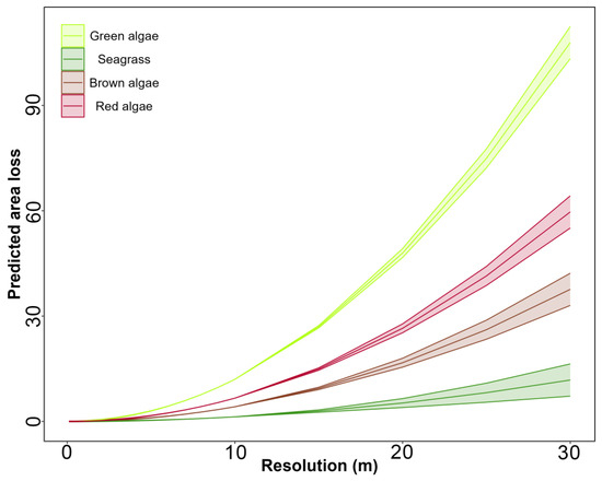 Predicted area loss for different vegetation types (green algae, seagrass, brown algae, and red algae) as a function of spatial resolution. The lines represent Generalized Linear Model (GLM) predictions, and shaded areas indicate standard errors. As the resolution decreases, predicted area loss increases for all vegetation types, with green algae showing the highest loss and seagrass the smallest at coarser resolutions.