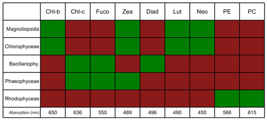 Photosynthetic and carotenoid pigments present (Green) or absent (Red) in each taxonomic class present in the Neural Network Classifier, along with their absorption wavelength measured with spectroradiometer, Chl-b—chlorophyll-b, Chl-c—chlorophyll-c, Fuco—fucoxanthin, Zea—zeaxanthin, Diad—diadinoxanthin, Lut—lutein, Neo—neoxanthin, PE—phycoerythrin, PC—phycocyanin; [25,26,54,55,56].