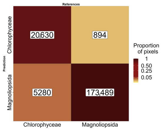 A cover of at least 80% was sufficient to have all the 80 mm pixels correctly classified, except for Magnoliopsida, which required a higher cover (>90%) to be accurately classified. Concerning the probability of each class, there is a linear relationship between the percent cover and the confidence of the model to predict the class. To predict green macroalgae with a model likelihood of 0.85, a cover of 93% was needed, 90% for seagrass, 92% for red macroalgae, and 97% for benthic diatoms. When the vegetation cover of a given class was 100%, coarser high-flight pixels were correctly classified for all the classes except for bare sediment, which was only correctly classified 80% of the time. This phenomenon may be attributed to the time gap between the two flights, allowing for microphytobenthos migration to the sediment surface during low tide, consequently altering the model’s classification from bare sediment to Bacillariophyceae.