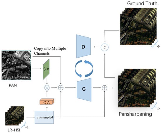 The hyperspectral pansharpening problem is addressed as a task-oriented challenge to retain the spectral information of the LR-HSI and the spatial details of the PAN image. This is accomplished using a generative adversarial strategy to find the optimal solution, as shown in Figure 1.
