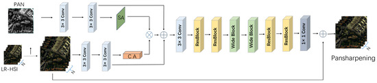 The HS pansharpening process is essentially a form of super-resolution, achieved by using the simultaneously acquired PAN image to enhance the resolution of the HS image. He et al. [11] introduced HyperPNN, a convolutional neural network designed for HS pansharpening. HyperPNN comprises two sub-networks: one for channel (substitute of spectral in this context) prediction and another for spatial–spectral inference, which leverages both channel and spatial contextual information. Subsequently, the attention mechanism was incorporated to enhance both channel and spatial fidelity [12,13,14]. Zheng et al. [12] proposed a two-step fusion method in which the original LR-HSI is first upsampled using a super-resolution technique, followed by training the model with the upsampled image. Zhuo et al. [13] proposed a deep–shallow fusion network with detail extractor and spectral attention to extract more information from input image.