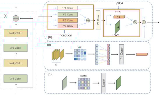 The Wide Block module incorporates the Inception [32] (Figure 3c) and Efficient Spatial and Channel Attention Module (ESCA) (Figure 3d). The Inception module can be repeatedly stacked to form larger networks, enabling the efficient expansion of network width while improving deep learning network accuracy and preventing overfitting. The advantages of the Inception module include its ability to perform dimensionality reduction on larger matrices while aggregating visual information at different scales. This allows neurons to dynamically adjust their receptive field size and extract features from multiple scales through selective convolution with kernels of varying sizes. The ESCA module captures spatial and spectral information from images without dimensionality reduction, ensuring efficient cross-channel interactions essential for high-performance channel attention. This design adds minimal complexity while significantly enhancing model performance. Detailed construction is illustrated in Figure 4.