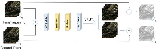 Liu et al. [18] proposed PSGAN to achieve pansharpening using the GAN framework. They employed a dual-stream CNN architecture as the generator, which was designed to produce high-quality pansharpened images using downsampled PAN and high-resolution images. Simultaneously, a fully convolutional discriminator was used to learn an adaptive loss function, enhancing the fidelity and overall quality of the pansharpened images. Ma et al. [19] developed Pan–GAN, which uses a residual network encoder–decoder in the generator to unsupervisedly generate fused images. The model interpolates multispectral images to match the resolution of PAN images, stacking the channels as input. A conditional discriminator network handles two tasks: preserving spectral information from multispectral images and maintaining spatial details from the panchromatic image, using separate discriminators to enhance image fidelity.