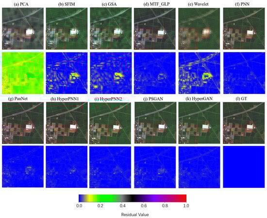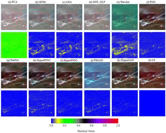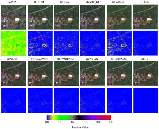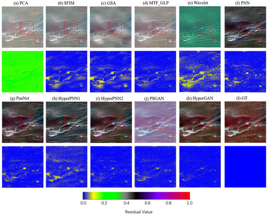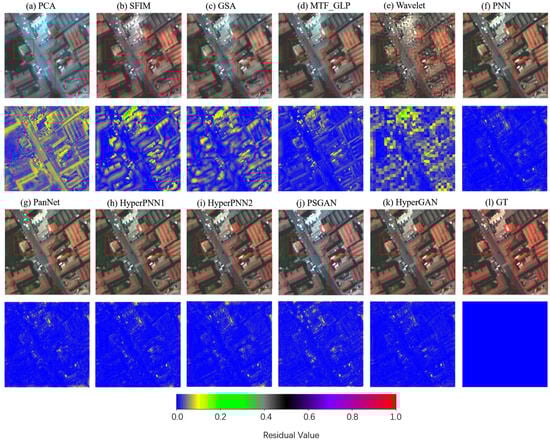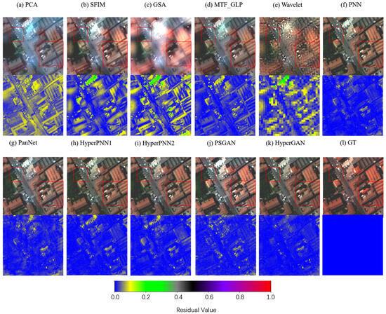 The residual map concerning the Ground Truth (GT) is represented in blue, where a larger blue area indicates greater similarity to the GT. From the fused images, it is clear that HyperGAN achieves the best results, both in terms of spatial details and spectral fidelity. Additionally, the residual map for HyperGAN shows the largest blue area, further reinforcing this observation. Both visual comparisons and quantitative results strongly affirm the effectiveness and superiority of HyperGAN.