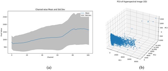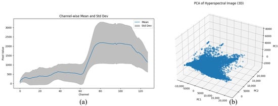The original HSI was acquired by the ROSIS [34] sensor and comprised 115 spectral bands ranging from 430 to 960 nm. The spatial dimensions of the image were 1096 × 1096 pixels, with each pixel having a geometric resolution of 1.3 m × 1.3 m. Thirteen noisy spectral bands were discarded, resulting in an HSI with 102 bands spanning 430 to 860 nm. This region was divided into 45 non-overlapping cubic patches of 120 × 120 × 102 pixels each, which constituted the GT for the Pavia Center dataset. To generate the corresponding PAN images and LR-HSIs for each high-resolution HSI, Wald’s protocol [35] was followed. PAN images of size 120 × 120 were generated by averaging the first 61 spectral bands of the Ground Truth. LR-HSIs of size 20 × 20 × 102 were created by spatially blurring the Ground Truth with a 12 × 12 Gaussian filter and then downsampling the result. For the Pavia Center dataset, the downsampling factor was set to 6. For training, 36 cubic patches were randomly selected, and the remaining nine patches were used as the test set. The training process took 1.5 h.