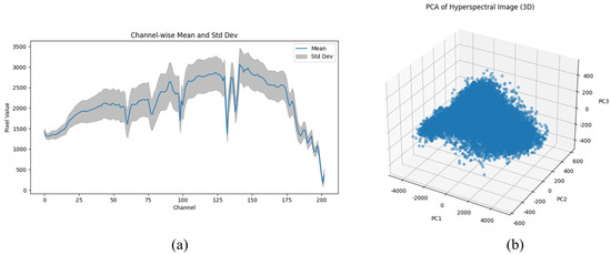 The original HSI is from the Chikusei dataset [38], consisting of hyperspectral images captured in Chikusei, Ibaraki, Japan, by the Hyperspec-VNIR-CIRIS spectrometer. These images have a ground sampling distance of 2.5 m and 128 spectral bands ranging from 363 nm to 1018 nm. The original Chikusei HSI has spatial dimensions of 2517 × 2335 pixels and a geometric resolution of 2.5 × 2.5 m per pixel. For this study, the top-left corner of the HSI, sized 2400 × 2160 × 128 pixels, was used and divided into 90 non-overlapping patches of 240 × 240 × 128 pixels, which serve as the GT for the dataset. Following Wald’s protocol, PAN images of 240 × 240 pixels were generated by averaging the first 65 spectral bands of the GT. LR-HSIs were created by spatially blurring the GT using a 12 × 12 window and downsampling. For the Chikusei dataset, the downsampling factor was set to 6. Out of the 90 patches, 72 were randomly selected for training, while the remaining patches were used for testing. The training process took 12.61 h.