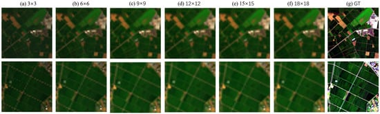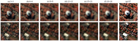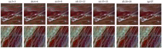 We applied Gaussian kernels of sizes 3 × 3, 6 × 6, 9 × 9, 12 × 12, 15 × 15, and 18 × 18 to process the original data, and the quantitative comparison results between the upsampled data and the GT for the Pavia Center dataset, the Eastern Tianshan dataset, and the Chikusei dataset are presented in Table 8, Table 9, and Table 10, respectively. As demonstrated in these tables, the data processed with a 12 × 12 Gaussian kernel achieved the highest CC, PSNR, and SSIM values while having the lowest SAM and ERGAS values. Figure 14, Figure 15 and Figure 16 depict the visual comparisons of the data processed using different Gaussian kernels with the GT for the Pavia Center, Eastern Tianshan, and Chikusei datasets, respectively.