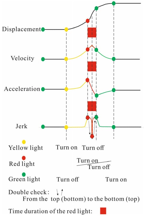 The key to the TLS is how to select the kinematic indicators and define thresholds; in this case, rate, acceleration, and jerk will be used as the thresholds to synthetically determine the color of the signal light. Commonly, velocity-related indicators were considered, using a frequency-based method [], and the inverse velocity method []. However, acceleration or jerk are rarely considered to establish a threshold and warning system. One possible reason is that jerk was subjectively judged to correlate poorly with displacement, compared to velocity or acceleration, especially when acceleration showed lower performance in warning work.