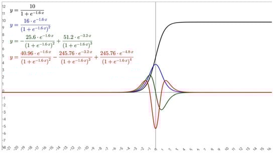 On this basis, we try to find theoretical grounds for the TLS. It is easy to find that the single step-like displacement is similar to the Logistic Function. Meanwhile, the rate, acceleration, and jerk are the displacement’s first-order, second-order, and third-order derivatives. If the curves of the derivative functions of the Logistic Function are all similar to those in Figure 3, then our inference is valid, and in particular, the jumps of the jerk have theoretical support.