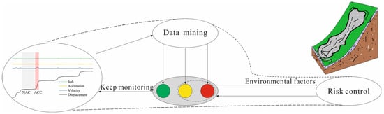 (2) 2nd stage: Warning. Based on the TLS, thresholds that consist of the rate, acceleration, and jerk are set. According to the threshold of the TLS, green, yellow, and red warning signals can be issued, respectively. The significance of each signal is represented as mentioned before. The objects of the warning mainly include the persons responsible for disaster prevention and mitigation at all levels of the county, the town, and the village, the persons responsible for monitoring, the persons responsible for safety, and all the residents under the landslide risk.