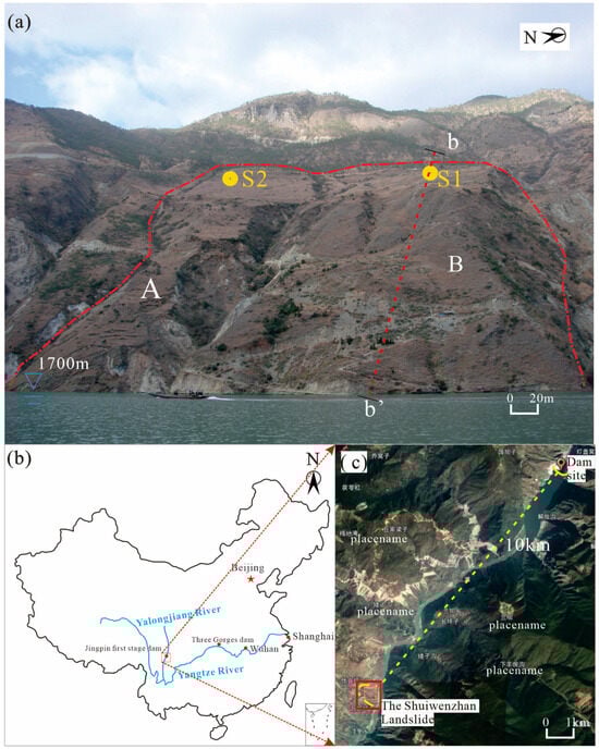 Study area and the overview of the Shuiwenzhan landslide. (a) The overview of the landslide, (b) the location of the study area, (c) the landslide position to the river and the reservoir dam.