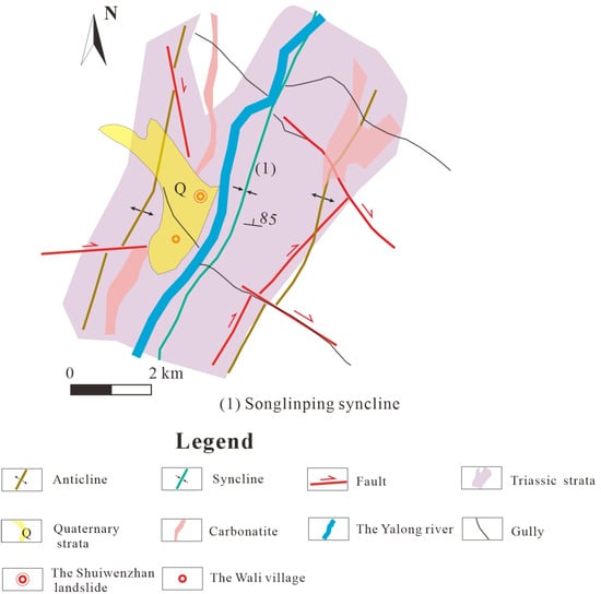 The case area is characterized by narrow “V”-shaped valleys and high, steep mountains, notably downcutting by the Yalong River. The Songlinping syncline in the NE–SW direction controls the morphology of bedrock in the case area. It is located on the right bank, close and running approximately parallel to the river (Figure 7). Additionally, the secondary folds and small faults further modify the topographical features of both banks. The geological units mainly consist of Triassic strata, including greenschist, marble, and metamorphic sandstone and slate from the lower to the upper strata. There are large loose Quaternary deposits underlying the Wali village on the left bank near the Shuiwenzhan landslide (Figure 7).