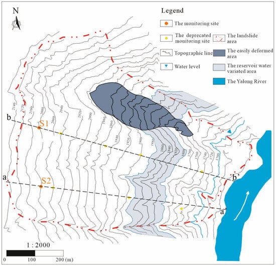 The Shuiwenzhan landslide with typical stepwise deformation in the Jinping reservoir area in southwest China is selected as a study case. It is located on the left bank of Yalong River, about 9 km away from the dam of Jinping’s first-level hydropower station (Figure 6). The potential landslide damage is harmful to the villagers’ life and property and the safety of the reservoir area, which is of practical research significance.