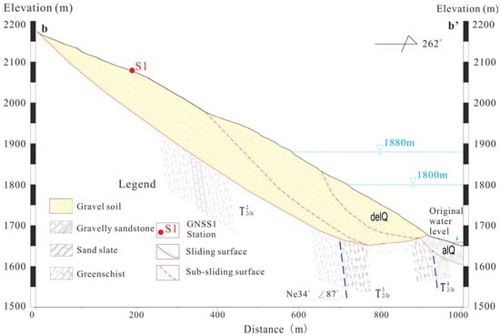 The volume of the landslide is about 15 million m3. The plan spread of the landslide is similar to a skip shape (Figure 8). The longitudinal length of the landslide is 1000 m, the width is 570 m, the thickness of the slide body is 64~120 m, and the average thickness is about 80 m. The upper part of the slide surface is slightly steeper, with an inclination of 28°–33°, while the lower part is slightly slower, with an inclination of 20° (Figure 9). The lower edge of the shear exit is slightly inverted, the lowest elevation is 1660 m, and the rear edge elevation is 2120 m. By the longitudinal gully cutting, the surface of the slide body is decomposed into two parts close to the upstream and the downstream, respectively. The front part of the landslide is grey-black siltstone with sandstone in the third section of the Triassic Zaogunao Formation, and the middle and upper part of the landslide is thin grey-green schist, a thick layer of breccia marble, and a small amount of sandstone. The overall rock stratum is roughly NE20∠85°. The sliding soil is mainly composed of black mud and gravel, with broken material and a loose structure.