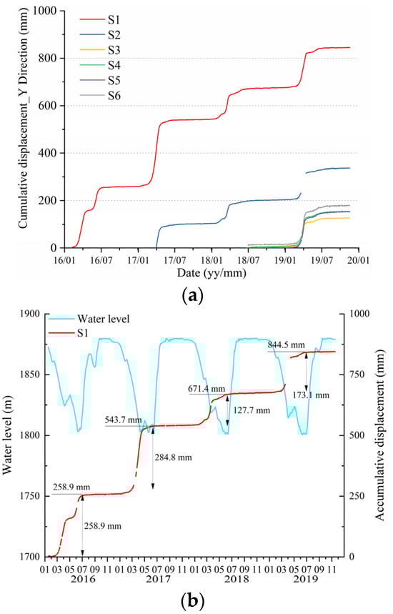The GNSS points obtained displacements in three directions, of which the Y_direction is perpendicular to the riverbed and accounts for more than 95% of the total displacement. The cumulative displacement time curves of the six monitoring points are shown in Figure 10a. During 2016–2019, all the displacement curves show stepwise characteristics, and the stepwise deformation occurs every summer, with a single displacement amount between 100 and 300 mm. Because of the similarity of the changes among the six curves, point S1, which has the longest monitoring period and the largest displacement, is selected for the following study. The displacement increment of S1 shows regularity with the fluctuation in the water level, as shown in Figure 10b, and stepwise deformation occurred in the reservoir water drawdown period of each year, with the largest stepwise amount of 248.8 mm. An eighty-meter drawdown of the river water level makes the seepage direction from the slope to the river, declines the undergrounder water level of the landslide body, and softens the materials of some rock and soil. Complex mechanical–chemical mechanisms during the drawdown period cause this rapid deformation. In addition to the average of the first two years being larger than the last two years, the yearly displacement does not find any other obvious rule, which is somewhat random and difficult to predict. New data need to be obtained for related analysis.