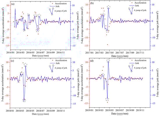 (a–d) Time series of acceleration and jerk each year from 2016 to 2019.