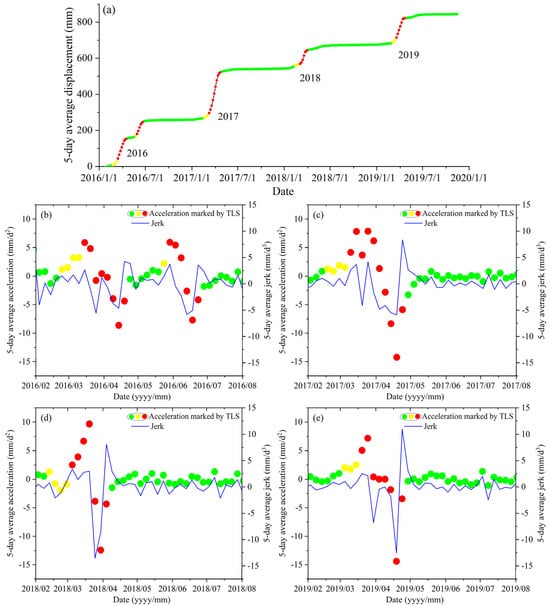 Signal lights in TLS presented on time series of the displacement and acceleration during 2016–2019. (a) displacement curve marked by signal lights, (b–e) jerk curve and acceleration curve marked by signal lights from February to August each year.