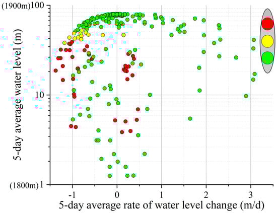 As shown in Figure 13, the original time series of signal lights can be de-temporalized and displayed on the water level vs. the rate of water level change axis, reflecting the effect of the water level and the rate of water level change on the distribution by light color. The clustering of yellow and red signals is obvious, with yellow signals mainly clustered in the reservoir drawdown period between 1860 and 1840 m, and the distribution of red signals mainly disturbed by some of the green signals, which affects the determination of the threshold value. Therefore, classifier algorithms in machine learning were used to further determine the thresholds.