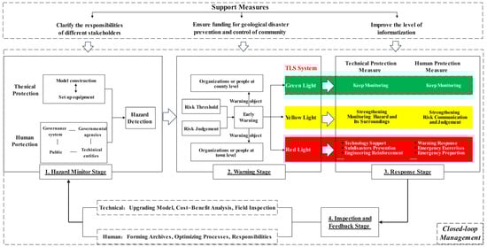 (4) 4th stage: An inspection and feedback mechanism is suggested to be established. The mechanism also consists of the technical-based and the personnel-based parts, respectively. Regarding the technical-based part, the focal points are analyzing the monitoring results during a new TLS internal cycle, re-investigating the landslide field, and justifying and updating the model thresholds. Regarding the personnel-based part, measures such as recording documents of early warning, reviewing the implementation of the responsibilities, conducting a cost–benefit analysis, and optimizing the process of the closed-loop management system should be taken.