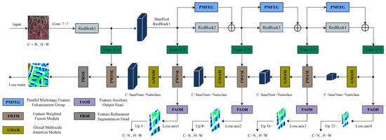 As illustrated in Figure 2, the AFENet is meticulously designed in an encoding–decoding structure, leveraging ResNet50 [25] as the foundational backbone for effective feature extraction. The architecture employs an innovative parallel multilevel feature enhancement group (PMFEG) to augment the encoder’s capabilities, along with residual fusion with ResNet50 to optimize multi-scale feature extraction. The jump connections of the features along the longitudinal direction at each level are processed through the feature-weighted fusion module (FWFM), which bridges the feature fusion between the encoder and the decoder. In the decoder phase, we introduce the global multi-scale attention mechanism (GMAM), which not only excels at computing features on a global scale but also effectively learns relationship from different scales, facilitating contextual information fusion. Ultimately, the processed features traverse the feature refinement segmentation head (FRSH), which generates the final segmentation result. The entire network is governed by feature auxiliary output heads (FAOHs) at each stage, while the loss function is meticulously constructed as a weighted sum of four auxiliary losses in conjunction with the main loss, ensuring robust performance throughout the training process. This thoughtful design enables AFENet to achieve precise feature representation and efficient encoding–decoding, delivering outstanding performance while maintaining low computational overhead.
