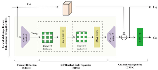 As shown in Figure 2, we integrate the PMFEG at three stages of the encoder, in parallel with the second, third, and fourth stages of the backbone network ResNet50. This approach gradually expands the receptive field by performing feature extraction in parallel at each stage. The PMFEG performs dimensionality reduction, feature extraction, and channel reallocation in parallel with the corresponding encoding backbone. These operations correspond to three sub-modules, as depicted in Figure 3: the channel reduction (CRDN), self-residual scale expansion (SRSE), and channel reassignment (CRSN) modules.