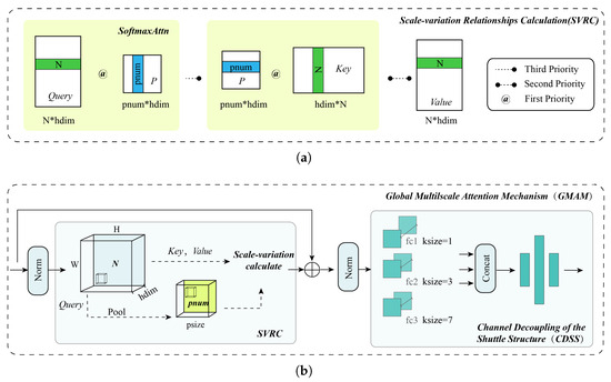 The details of each component in GMAM. (a) Scale-variation relationship calculation: this module contains several matrices, and to clarify their product relationships, three priority levels are used in the diagram. The first priority represents the highest level. (b) Illustration of global multi-scale attention mechanism.