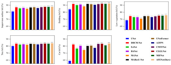 In the buildings category, MAResU-Net and CMTFNet both achieve segmentation accuracies (mIoU) exceeding 91.50%, while our method and CGGLNet surpass 91.90%, reaching 92.33% and 92.16%, respectively. This indicates the enhanced performance of AFENet in this category. Since buildings, low shrubs, and trees in HRRSIs are often distributed closely together, there can be a small inter-class gap in segmentation, which leads to mutual influences on the accuracy of these categories. Our network effectively addresses this issue, showing improvements over the latest methods in all three categories, specifically by 0.17%, 0.60%, and 0.34%, respectively.