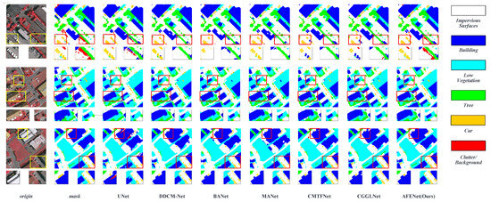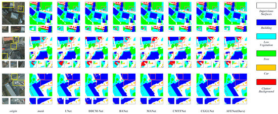 As illustrated in Figure 7, AFENet demonstrates strong performance on the Vaihingen dataset during the comparison experiments. In the first row, it is evident that AFENet effectively captures the areas of small objects such as cars, clutter, and other aggregates, accurately recognizing the corresponding classes and providing clear and complete categorization. In the second row of the original image, a building is surrounded by low shrubs and trees, presenting very little distinction between classes; however, AFENet excels at identifying the building in this context. Furthermore, for the edges of larger buildings affected by shadows, AFENet produces clear edge segmentation results. In contrast, for smaller buildings, AFENet successfully delineates the complete edges of the region, avoiding issues with broken segmentation edges and missed segmentation. In the third row, we examine cases where buildings and parking areas are affected by shadows, and it is evident that AFENet still achieves high-precision segmentation results under these conditions. This indicates that the AFENet can mitigate the influence of shadows on remote sensing image segmentation to some extent.