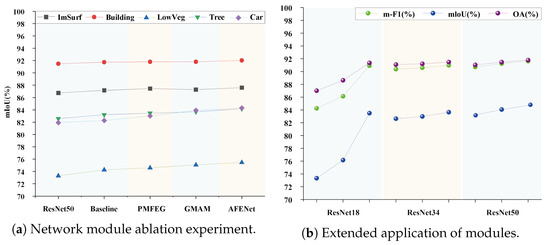 The AFENet with ResNet50 as the baseline improves the m-F1 metrics by 0.72% and 0.65% and the mIoU metrics by 1.21% and 1.07% over ResNet18 and ResNet34, respectively, with the addition of the two modules. It outperforms the other two models in the horizontal direction of Figure 9b, which provides an experimental basis for choosing it as an encoder.