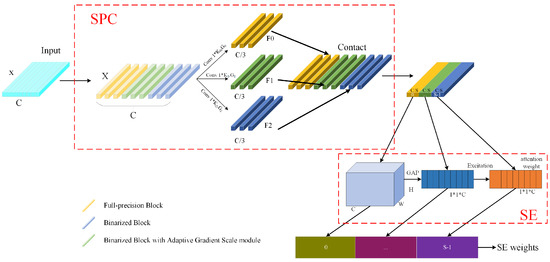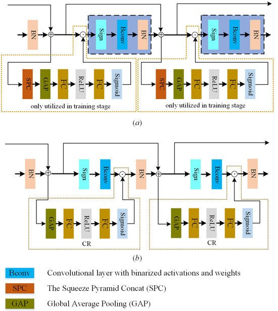 Figure 2a. SPC refers to the squeeze pyramid concat convolutional neural network structure, GAP represents the global average pooling layer, and FC stands for the fully connected layer. To maintain consistency with using only the sign function during the feedforward computation stage, the module’s output is forced to be positive. Through this operation, it is equivalent to multiplying each gradient unit by an adaptive positive scaling factor during the backpropagation stage without affecting the feedforward computation process. More importantly, the AGS module only exists during training and is removed during the inference stage, avoiding the addition of extra parameters and computations.