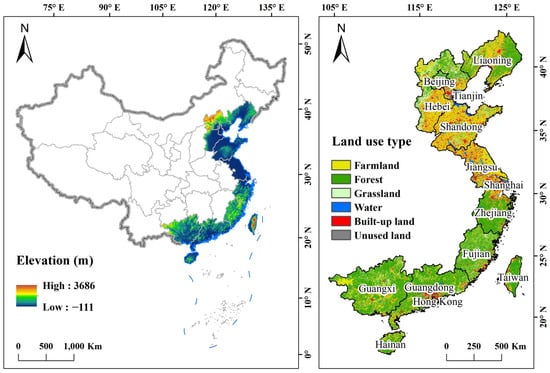 China’s coastal zone (CCZ), referred to in this paper, is shown in Figure 1. It is located in the third topography ladder in China, serving as the interface between the ocean and the inland continent. CCZ covers a broad latitudinal range (3°30′~43°29′N) and exhibits a large diversity of climate conditions. The whole study area from south to north spans the tropical, subtropical, and temperate zones, and it has an average elevation below 500 m, with a coastline of 18,000 km. The total area of CCZ is 133 × 104 km2, occupying about 13.9% of the total area of China. Since the reform and opening up, the urbanization of CCZ has continued to grow at a rapid speed. Currently, more than 50% of large cities and 40% of the national population are concentrated in CCZ [], making it the most developed area in China but also the region with the highest carbon emissions. Meanwhile, CCZ also serves as a huge carbon pool, playing an important role in regional and global energy flow and carbon cycling. However, its ecological environment is highly sensitive to climate change and human activities []. Therefore, CCZ is a key region for studying the terrestrial carbon cycle.