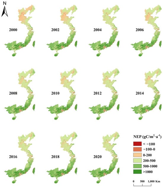 Net ecosystem productivity (NEP) can capture the dynamics of material cycling and energy flow, serving as a reliable measure of the carbon sink potential in terrestrial vegetation-soil ecosystems []. NEP can also help determine whether an ecosystem functions as a carbon source or a carbon sink. A positive NEP denotes that the ecosystem serves as a carbon sink. Conversely, a negative NEP means that it functions as a carbon source []. NEP can be estimated by the difference between NPP and soil heterotrophic respiration (Rh) [,]. The formulas are as follows: