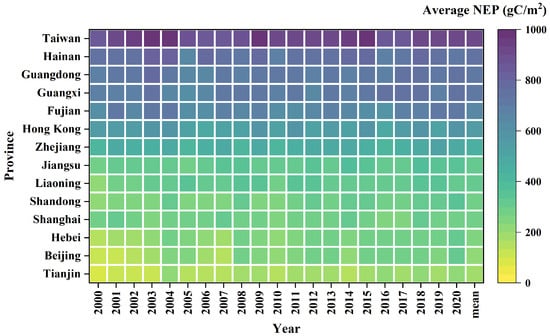 The average NEP in CCZ from 2000 to 2020 was 492.61 gC m−2 yr−1. NEP across coastal zones from north to south shows an obvious spatial heterogeneity (Figure 2). Combined with the statistical results of multi-year average NEP (Figure 3), Zhejiang Province was identified as the dividing line of this north–south difference. Overall, NEP in CCZ exhibits a pattern of higher values in the area south of Zhejiang Province and lower values in the north. Western Liaoning Province and most regions of the Beijing–Tianjin–Hebei region witnessed an obvious increase in NEP. The multi-year mean value of NEP in the area south of Zhejiang Province was 711.62 gC m−2 yr−1, while that in the area north of Zhejiang Province was only 285.36 gC m−2 yr−1.