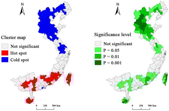 As shown in Figure 4, at the provincial scale, the hotspot cluster of NEP in CCZ also shows a distinct north–south difference. The high-value cluster of NEP is mainly observed in the provinces to the south of Zhejiang, including three cities in Fujian, five cities in Guangdong, four cities in Guangxi, as well as the majority of regions in Taiwan and Hainan. In contrast, the low-value cluster is mainly composed of most cities in the north of Zhejiang Province, including five cities in Liaoning, twelve cities in the Beijing–Tianjin–Hebei region, eleven cities in Shandong, nine cities in Jiangsu, and two cities in Zhejiang. Overall, the cold cluster in the north is relatively concentrated and covers a wider area, while the hot cluster in the south is relatively dispersed.