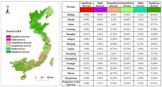 As shown in Figure 5, based on the MK test, the area with an upward trend of NEP was much larger than that with a downward trend. Specifically, the trend types of NEP in CCZ over the past 21 years were dominated by significant and insignificant increases, accounting for 46.12% and 23.95% of the total area, respectively, followed by an insignificant decrease (17.82%), a slight increase (4.74%), a significant decrease (4.58%), and a slight decrease (1.67%). At the provincial scale, the areas demonstrating an increasing trend in NEP are larger than those showing a decreasing trend in each provincial region. But in Shanghai, Fujian, Taiwan, and Hong Kong, the area that demonstrates an upward trend in NEP is smaller than that showing a downward trend in NEP. Notably, in the Beijing–Tianjin–Hebei region and Shandong Province, the increased area of NEP exceeded 50% of the respective area in each region. Regions with an insignificant decrease in NEP are mainly located in Zhejiang (41.93%) and the eastern parts of Liaoning (39.54%).